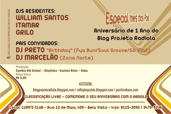 * É ISSO AI RAPAZIADA EDIÇÃO ESPECIAL MÊS DOS PAIS E ANIVERSÁRIO 1º ANO DO BLOG PROJETO RADIOLA, CONVIDADOS DO MÊS: DJ PRETO (SOUL GROOVE/SO VINIL/FYA BUN) E MARCELÃO ZN (PAI DOS DJS MURILO, MARCEL) ESTÃO TODOS CONVIDADOS, MUITO OBRIGADO PELO VÁRIOS ACESSOS E DOWNLOADS REALIZADOS NESTE PERIODO. *